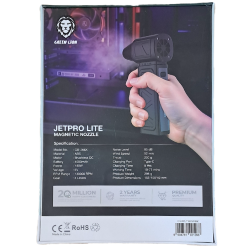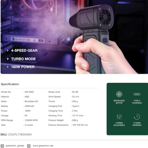 جت فن گرینGreen Lion Jet Pro Lite Magnetic Nozzle بیش از یک ابزار است؛ نمادی از نوآوری در حفظ فناوری‌های روزمره‌تان. با قدرت jet fan blower، راحتی cordless air blower و دقت magnetic nozzle blower، این دستگاه آینده تمیزکاری را امروز به دستان شما می‌سپارد.